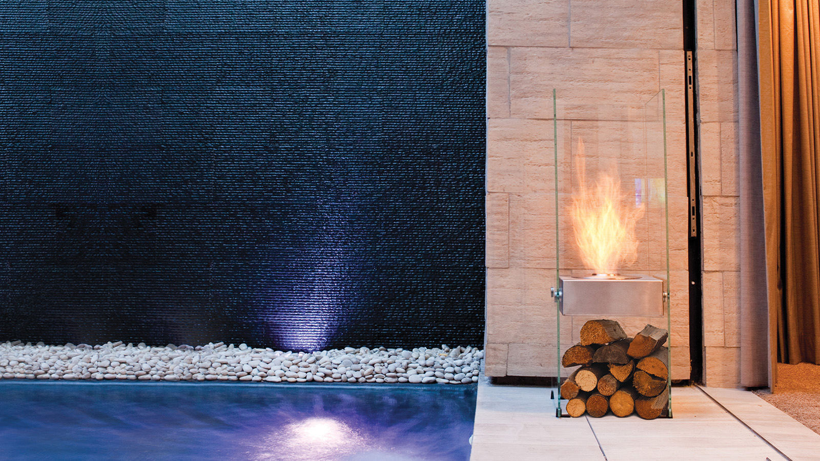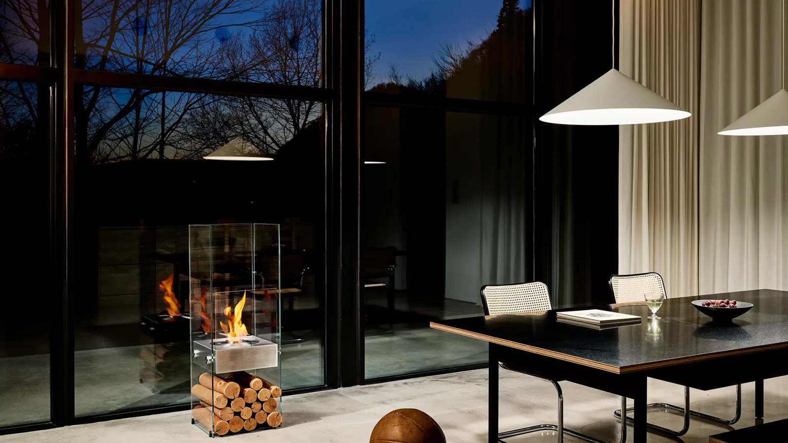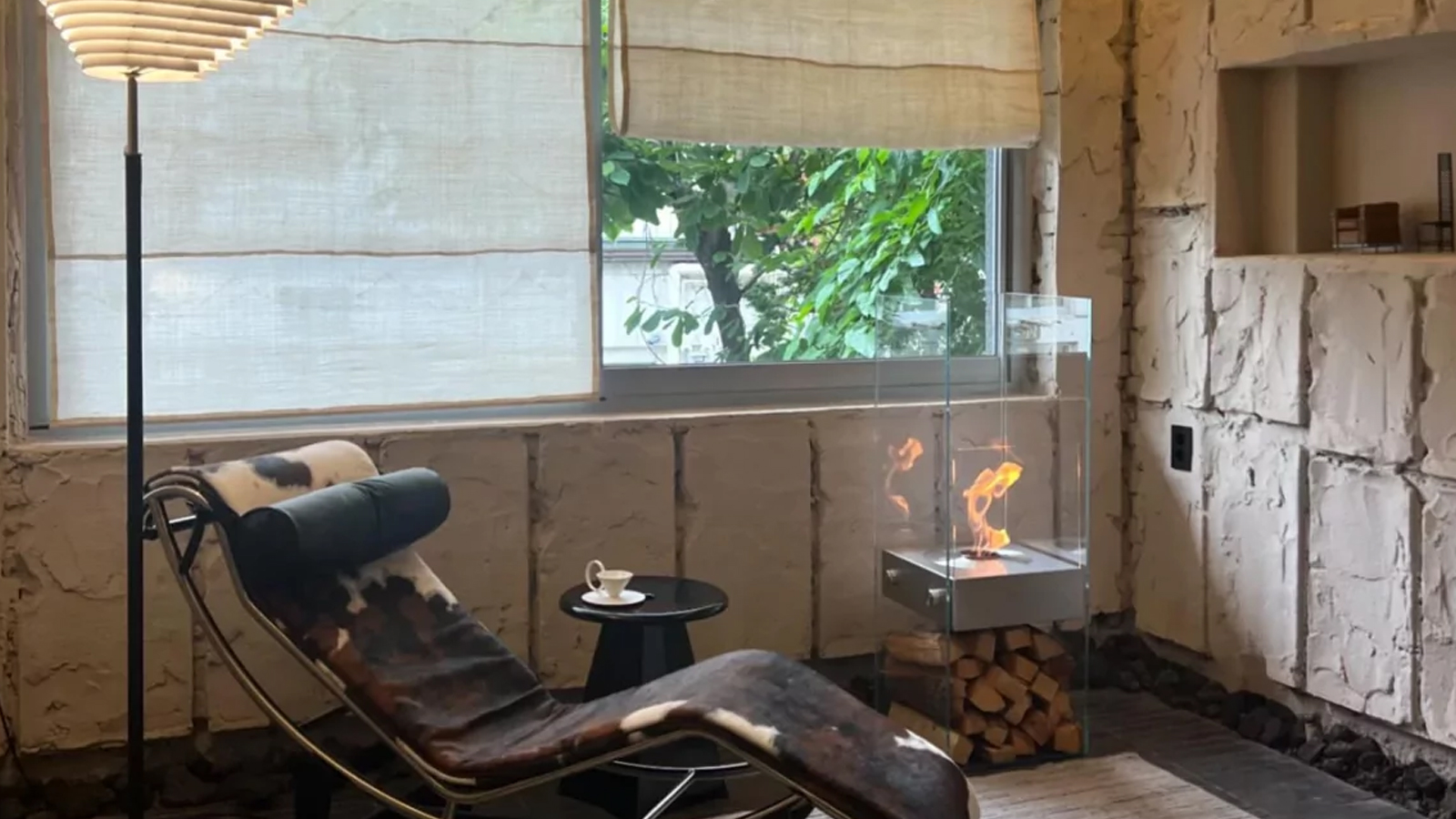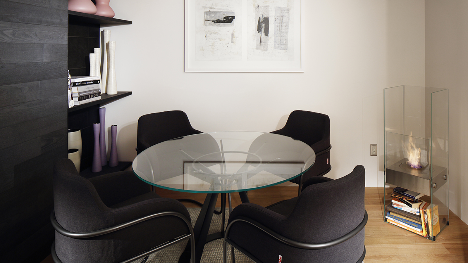 유리와 스테인리스 표면에 반사된 불꽃이 공간에 작지만 인상적인 포인트를 연출합니다.