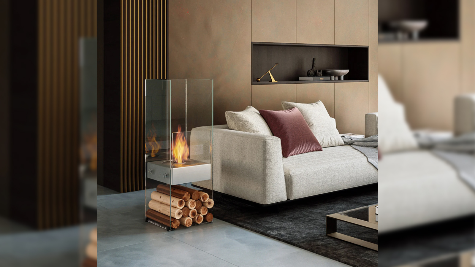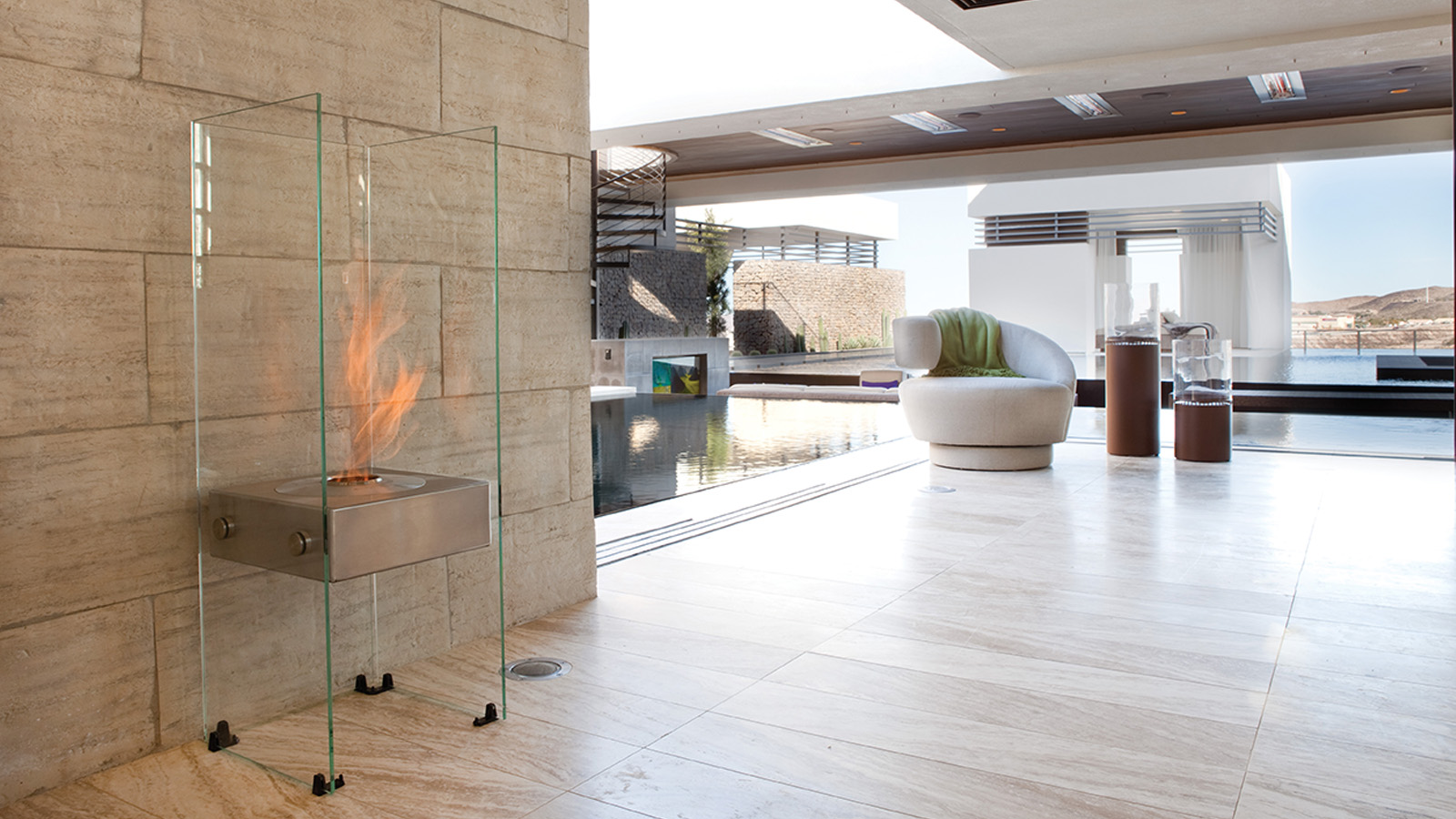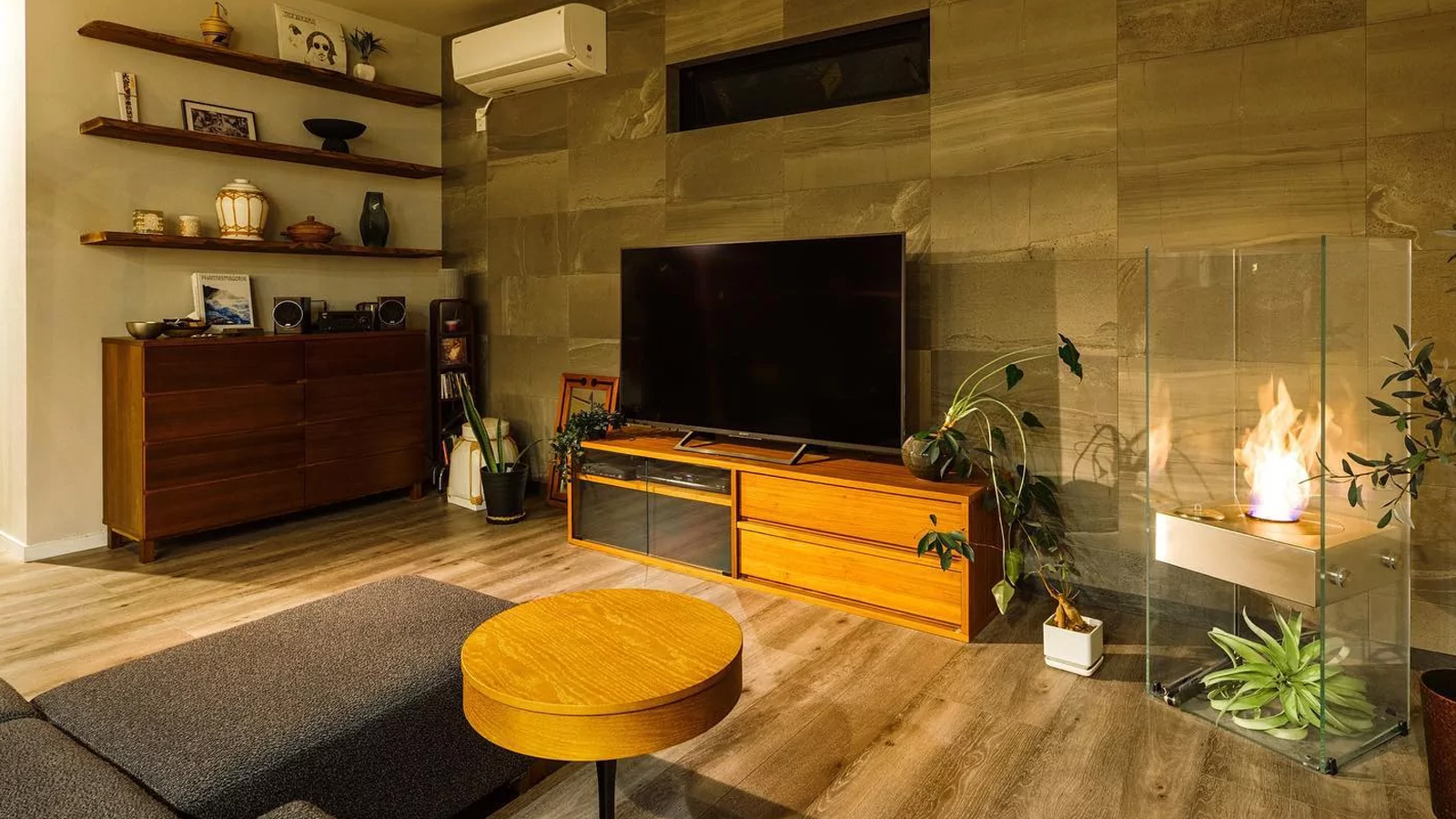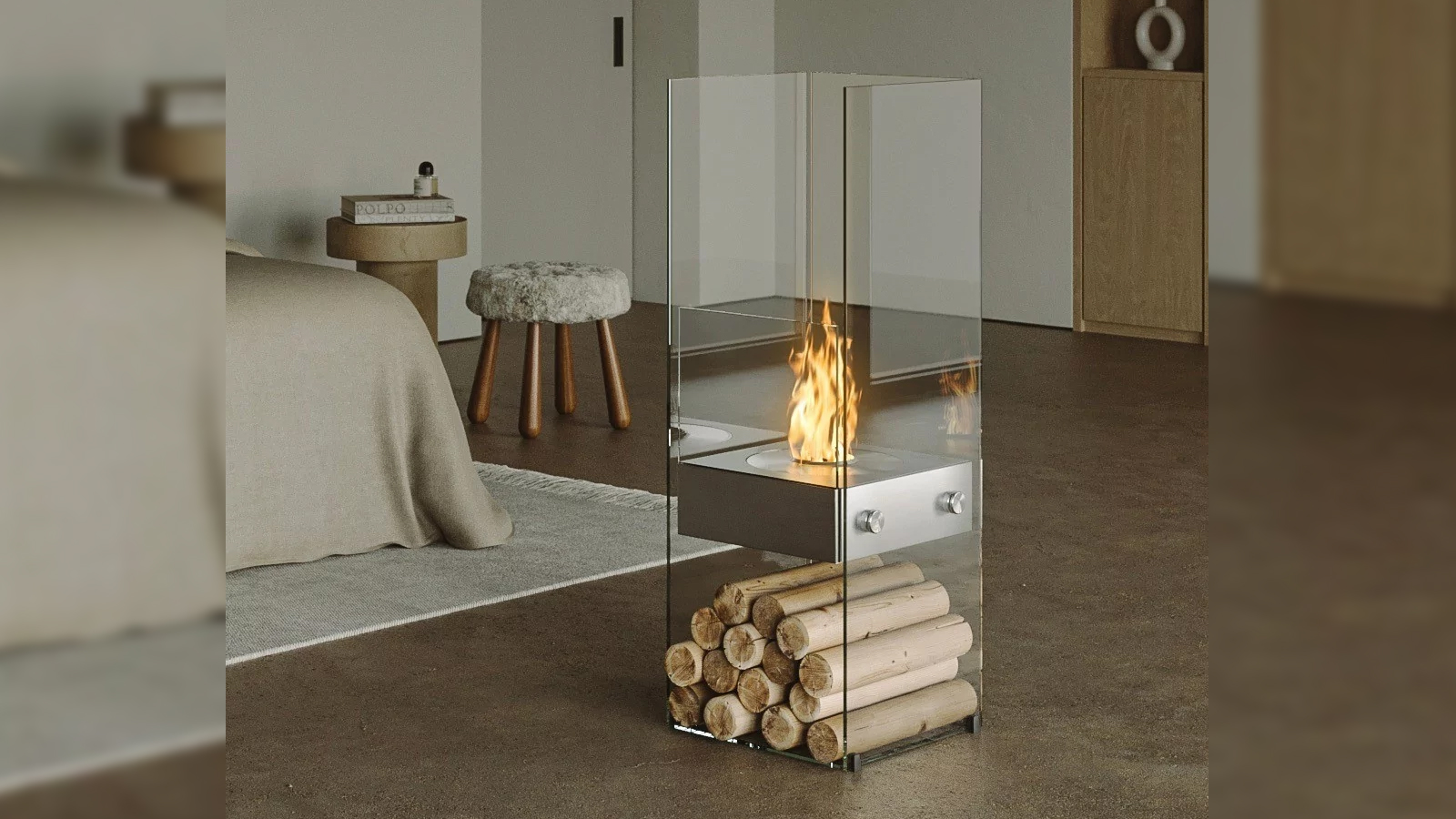 유리와 스테인리스 표면에 반사된 불꽃이 공간에 작지만 인상적인 포인트를 연출합니다.